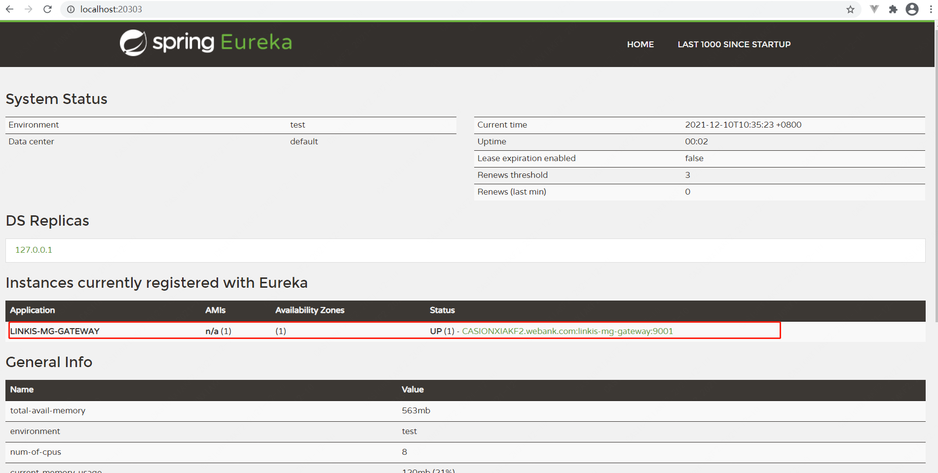After startup, you can view the list of eureka services through http://localhost:20303/
