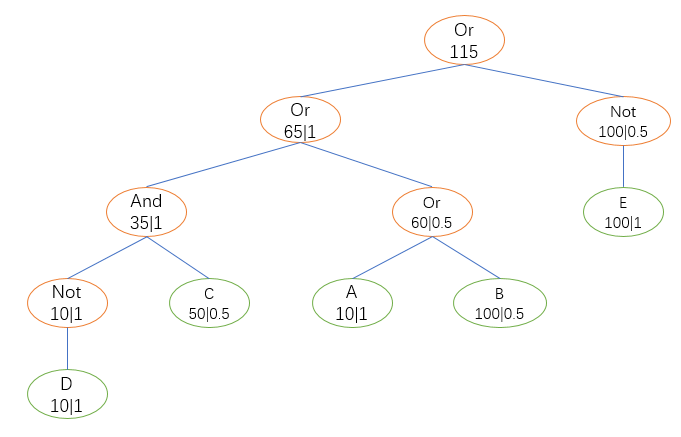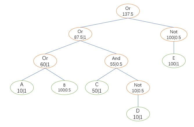 1. For leaf nodes, each node has two attributes: Cost and Weight. Cost is the cost calculated by CostCalculator. Weight is assigned according to the order of execution of the nodes. The current default is 1 on the left and 0.5 on the right. See how to adjust it later (the reason for assigning weight is that the conditions on the left have already been set in some cases. It can directly determine whether the entire combinatorial logic matches or not, so the condition on the right does not have to be executed in all cases, and the actual cost needs to be reduced by a certain percentage)