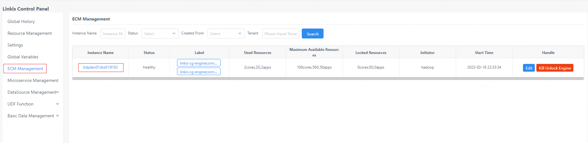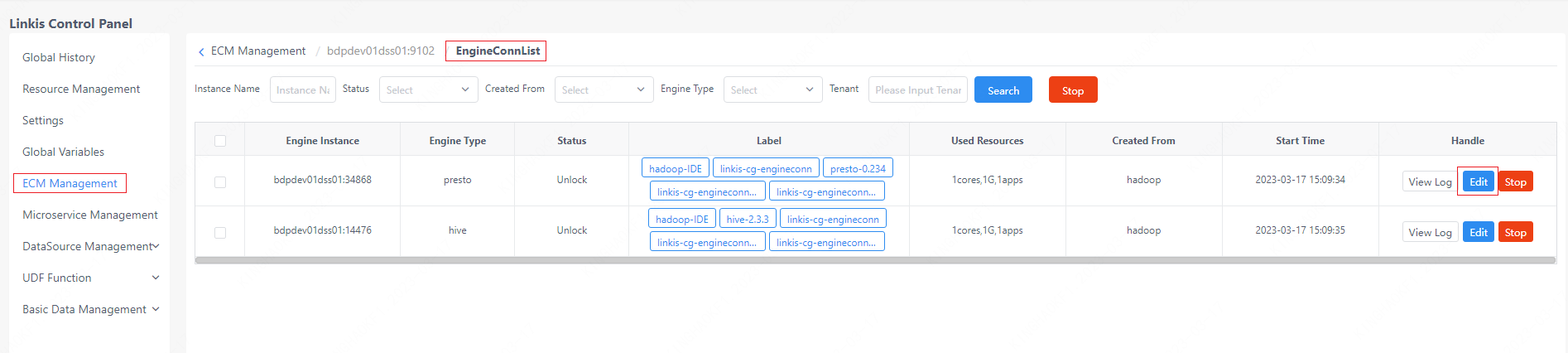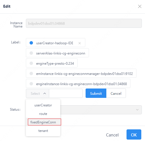 - The management console adds a specific label, and the adding path is as follows: login to the control panel -> ECM management -> click on an ECM instance name -> edit the EC to be fixed -> add a label of type FixdEngineConnLabel.