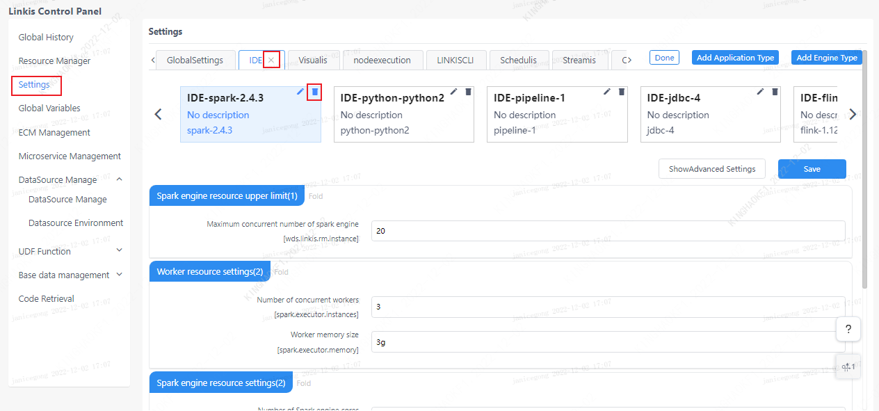 The parameter configuration interface provides the user-defined parameter management function, and the user can manage the related configuration of the engine on this interface. By default, engine configurations for IDE, Visualis, and nodeexecution applications are provided, and users can add or delete applications and engines according to their needs.
