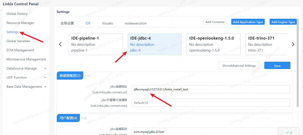 After the user clicks the engine label under the corresponding application, the engine parameters can be modified, such as modifying the JDBC engine under the IDE application. After modification, click the Save button.