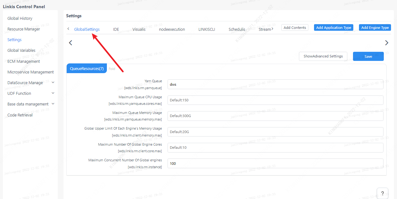 The global setting is mainly to configure the parameters of the queue resources, which will take effect for all application tasks after configuration.