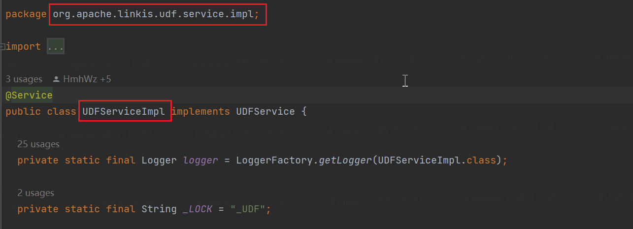 例如下图 UDFServiceImpl 的全限定类名就是:org.apache.linkis.udf.service.impl.UDFServiceImpl