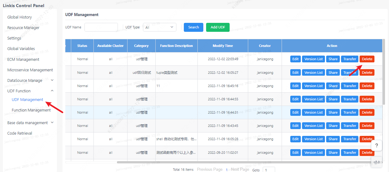 点击对应udf的删除按钮即可,注意:会删除该udf的所有版本。