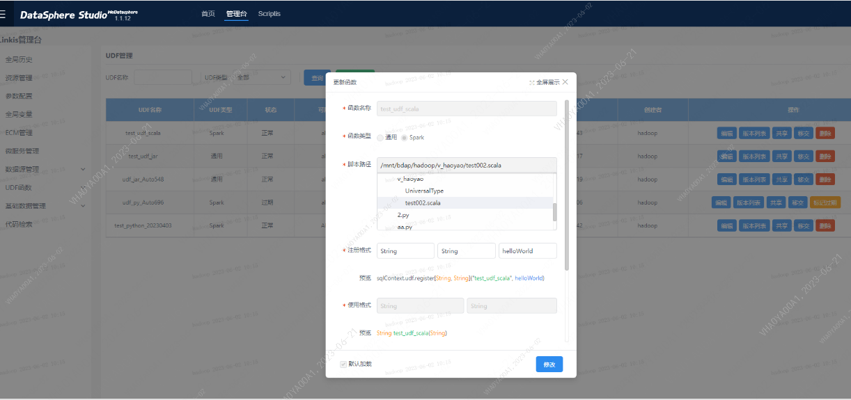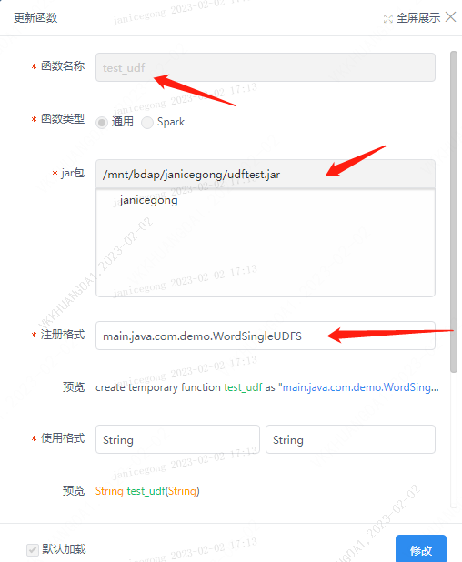• 在 【管理台>>UDF函数】 创建udf (默认加载)