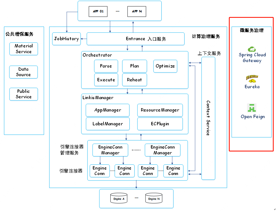 微服务治理包含了Gateway、Eureka、Open Feign等三个主要的微服务。用来解决Linkis的服务发现与注册、统一网关、请求转发、服务间通信、负载均衡等问题。整个Linkis是一个完全的微服务架构,每个业务流程都是需要多个微服务协同完成的。