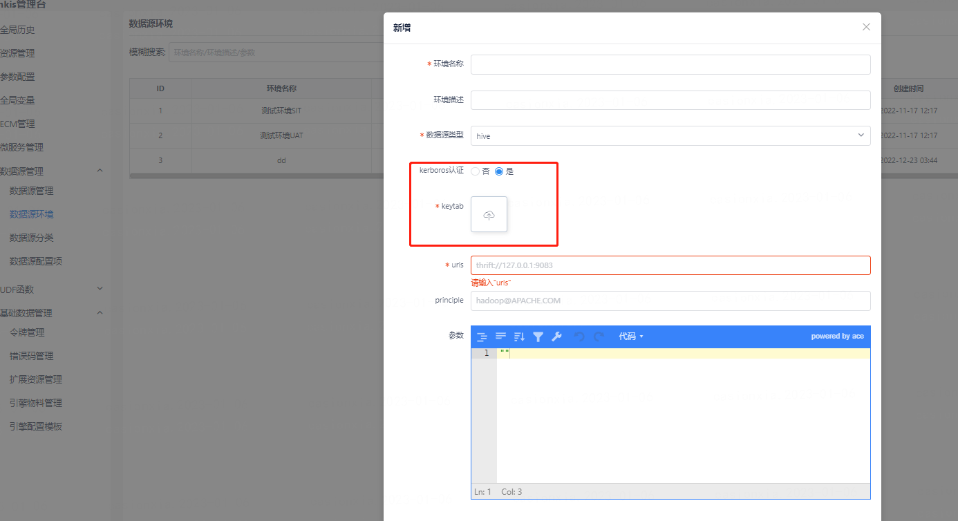 如果需要连接的hive数据源,对应的 hive 集群环境,有开启kerberos认证,需要在配置集群环境时,将kerberos以及keytab认证文件信息上传。