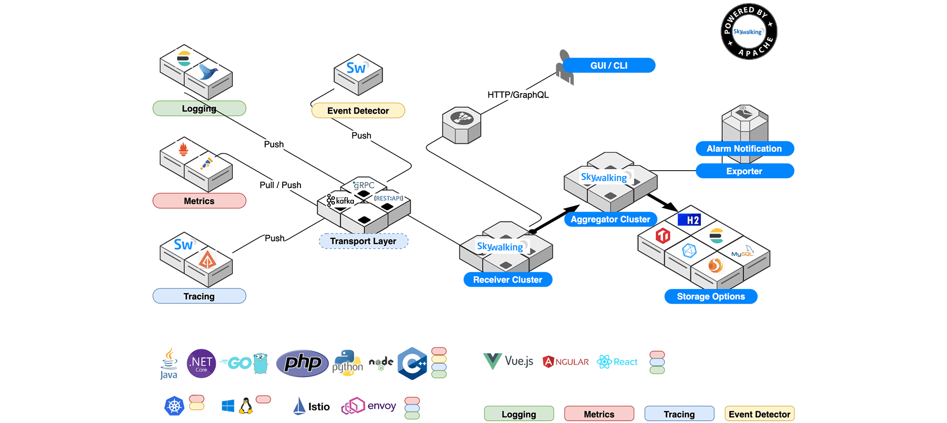 • Platform Backend:SkyWalking 的后端服务,支持数据聚合、分析以及流式处理等。