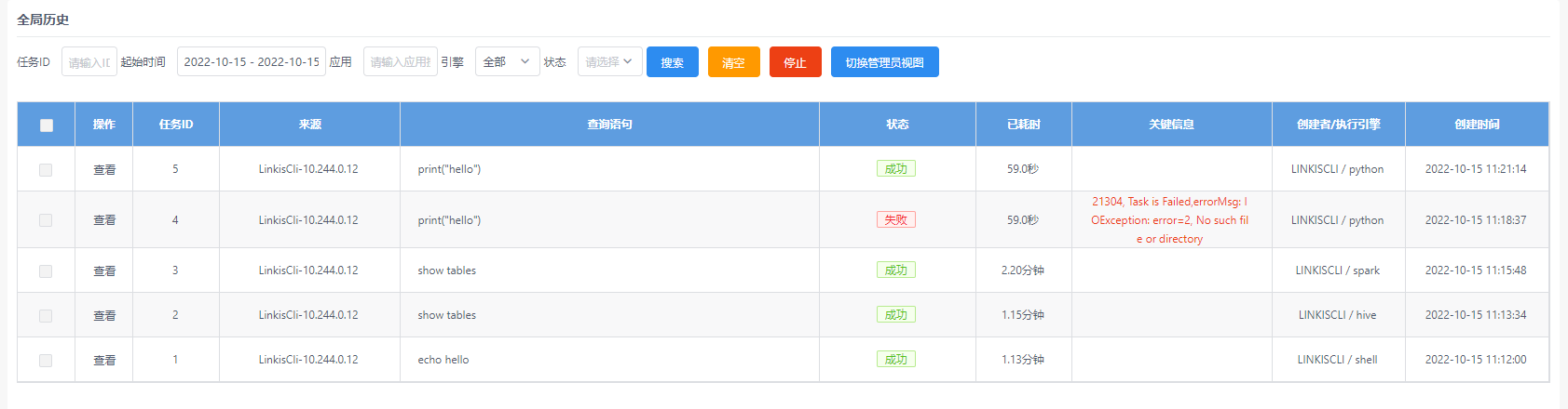 sh ./bin/linkis-cli -engineType shell-1 -codeType shell -code "echo "hello" " -submitUser hadoop -proxyUser hadoop