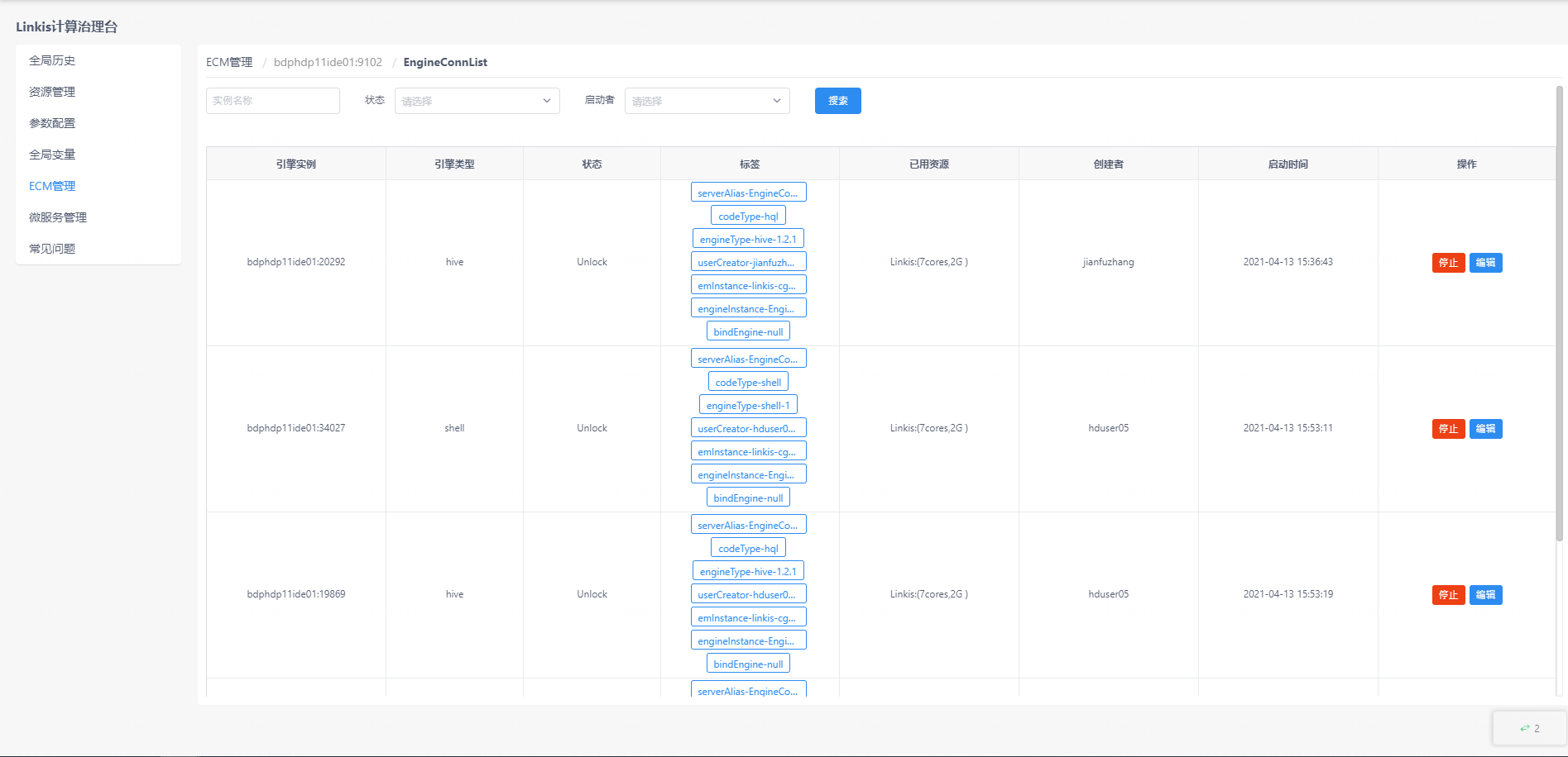 - 可以查看该ECM下所有的引擎信息,以及可以针对单个引擎进行的停止操作,查看运行日志,并且可以编辑引擎的标签信息。