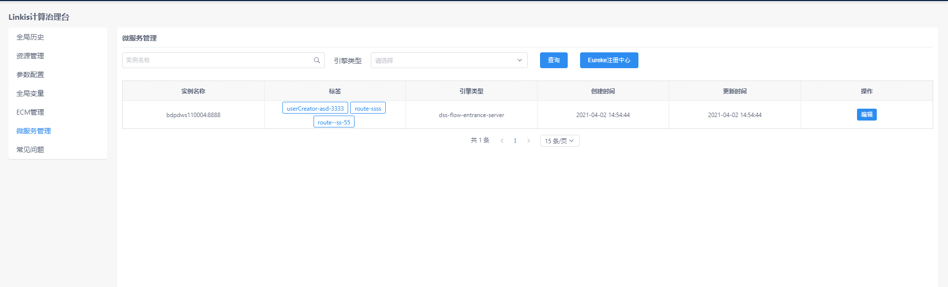 微服务管理界面可以查看Linkis下的所有微服务信息,该界面也仅允许管理员可见。linkis自身的微服务可以点击Eureka注册中心查看,与linkis关联的微服务会直接在该界面列出。