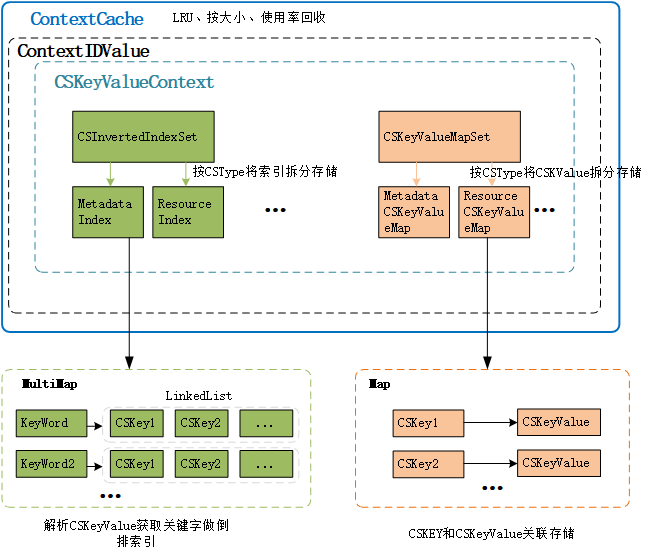 CSKeyValueContext:包含了按照类型存储并支持关键词的CSInvertedIndexSet索引集,还包含了存储ContextKey和ContextValue的存储集CSKeyValueMapSet。