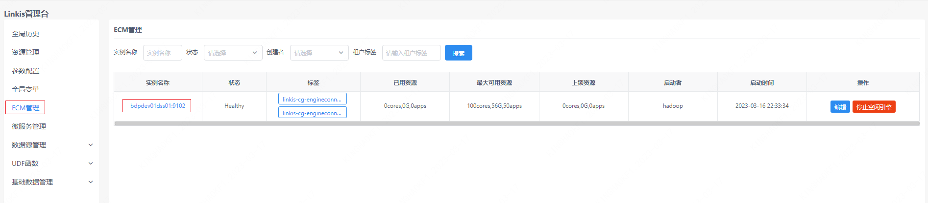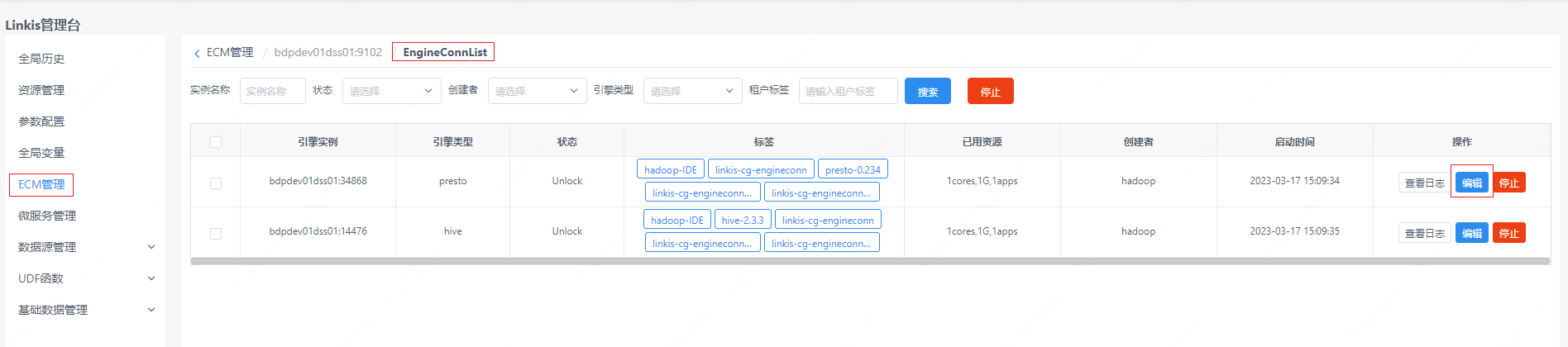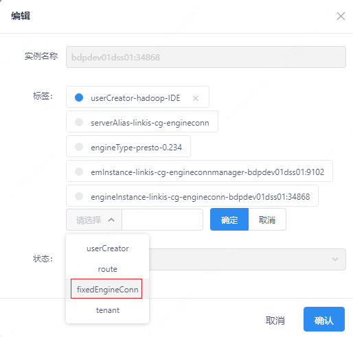 - 管理台添加特定标签,添加路径如下:登录管理台 -> ECM管理 -> 点击某 ECM 示例名称 -> 编辑待固定的 EC -> 添加 FixdEngineConnLabel 类型的标签。