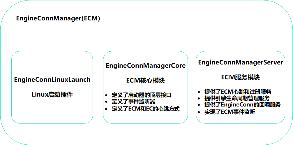 ECM的服务端,定义了ECM健康信息处理服务、ECM指标信息处理服务、ECM注册服务、EngineConn启动服务、EngineConn停止服务、EngineConn回调服务等顶层接口和实现类,主要用于ECM对自己和EngineConn的生命周期管理以及健康信息上报、发送心跳等。