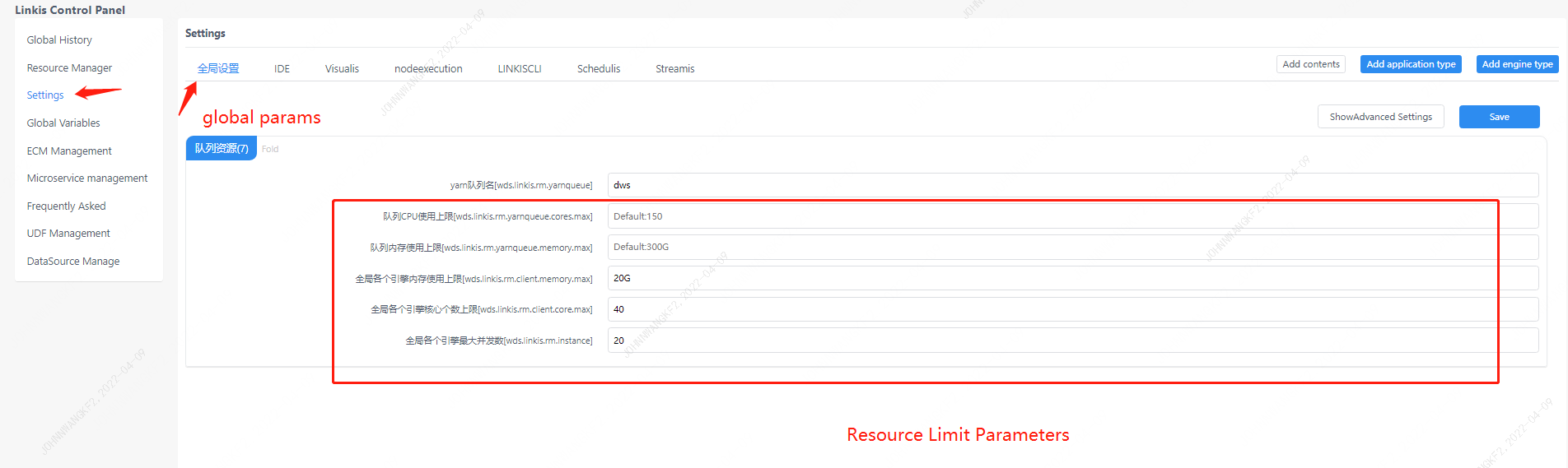 Linkis管理台参数时方便用户指定资源限制参数和默认的任务参数提供的Web界面,如下: 全局配置参数: 主要包含了全局队列参数[wds.linkis.rm.yarnqueue],任务默认采用的Yarn队列,支持在客户端StartUPMap里面另外进行指定 资源限制参数,这些参数不支持任务设置,支持管理台进行调整。