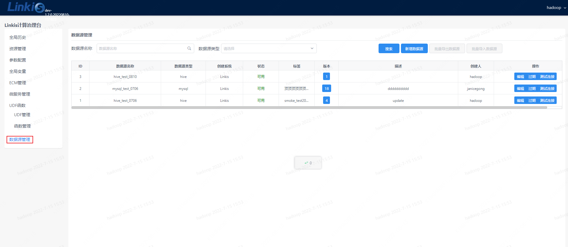 Linkis 1.2.0 开始,提供了 JDBC 引擎多数据源的支持,我们首先可以在控制台管理不同的数据源。地址:登陆管理台-->数据源管理-->新增数据源