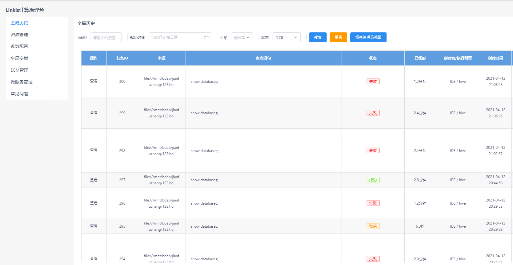 使用指南管理台的使用全局历史版本:Next(1.5.0)On this page全局历史1. 历史任务全局历史界面提供了用户自身的linkis任务提交记录,各个任务的创建时间、执行语句、状态都可以在此显示。并且可以根据任务ID、时间、引擎、状态等关键字过滤。 2. 任务详情点击左侧按钮可以查看任务执行日志、任务详情以及任务结果。任务执行失败可以通过任务日志排查问题。 3. 管理员视图对于linkis计算治理台管理员来说,管理员可以通过点击页面的切换管理员视图查看所有用户的历史任务。